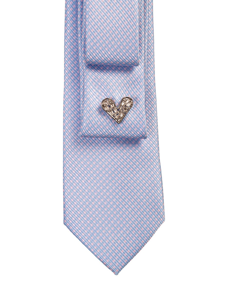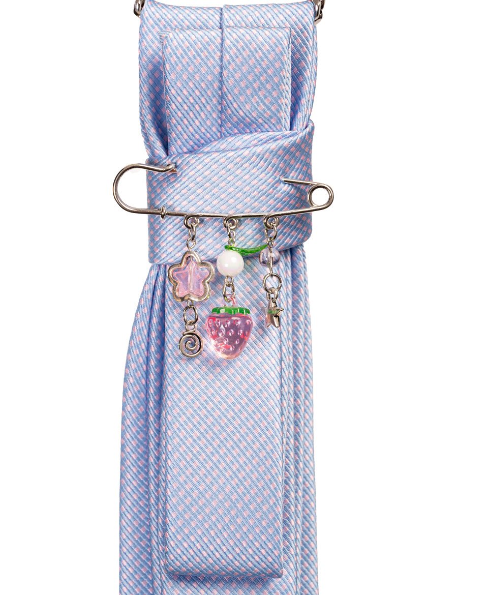 Cette cravate bleu ciel au tissage fin et délicat s’orne d’une épingle à nourrice ornée de charmes fraise roses et d’un cœur strass pour un style doux et décalé.