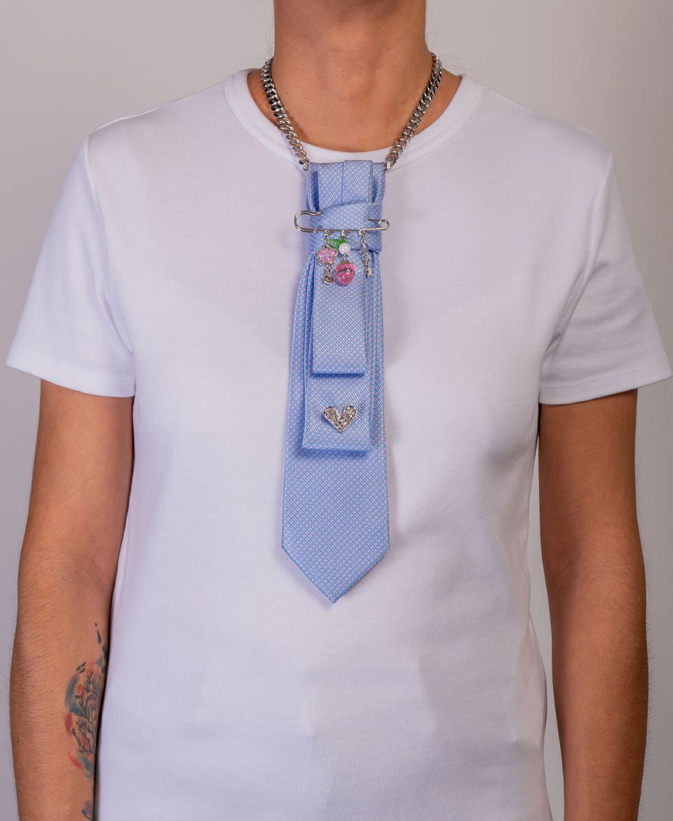 Cette pièce marie l’esprit preppy du bleu ciel et l’appel à l’enfant qui est en toi avec cette épingle à nourrice gourmande, créant un look unique qui mélange douceur avec élégance.