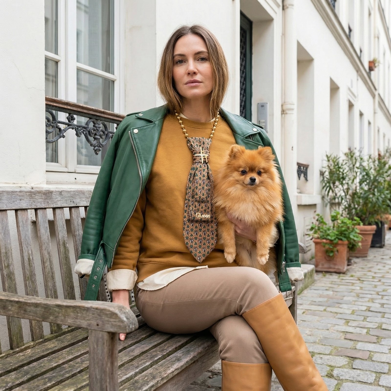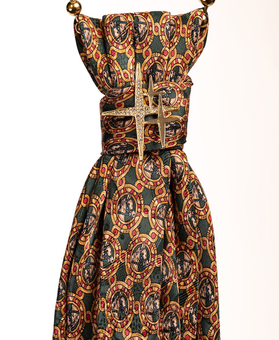Le tissu soyeux déploie un motif raffiné de chevaux stylisés entrelacés de chaînes et médaillons dans des tons vert émeraude, orange terracotta et beige doré, évoquant l’univers équestre et l’élégance des écuries royales. Les épingles à nourrice dorées ajoutent une touche contemporaine rock qui modernise ce thème classique.