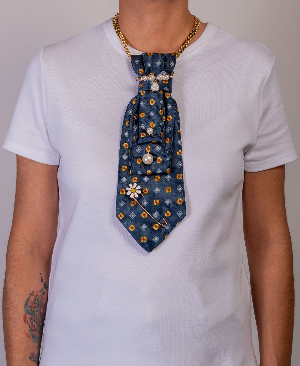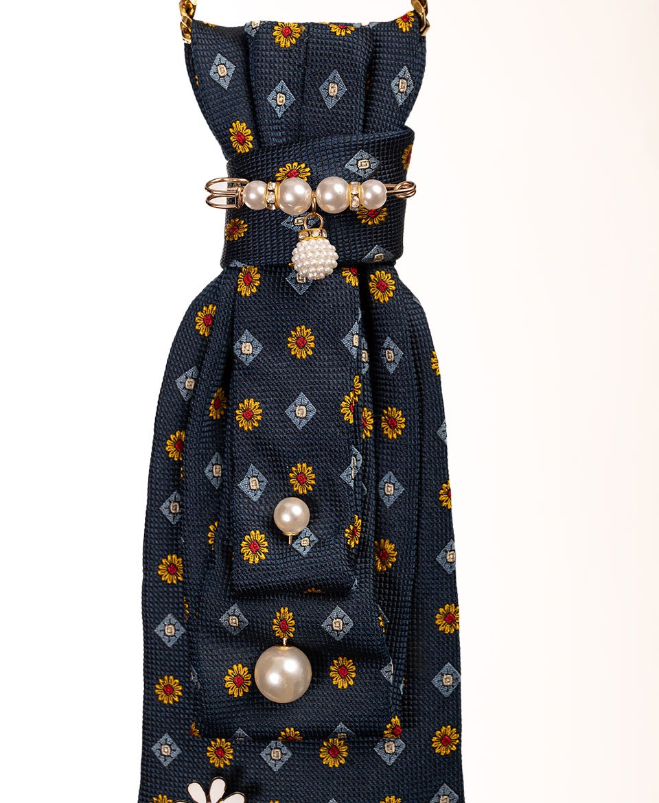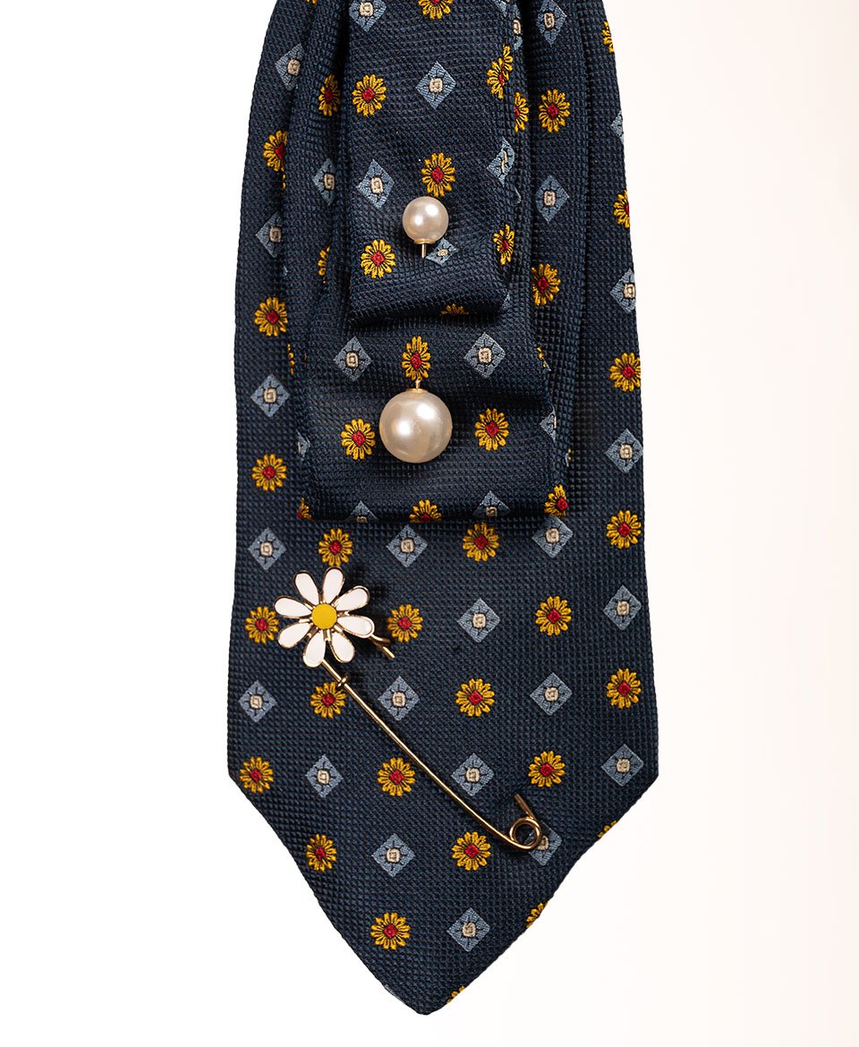 Le motif floral délicat se marie harmonieusement avec des perles nacrées et une broche marguerite qui ornent délicatement le nœud. L’épingle à nourrice dorée ajoute une note contemporaine inattendue.