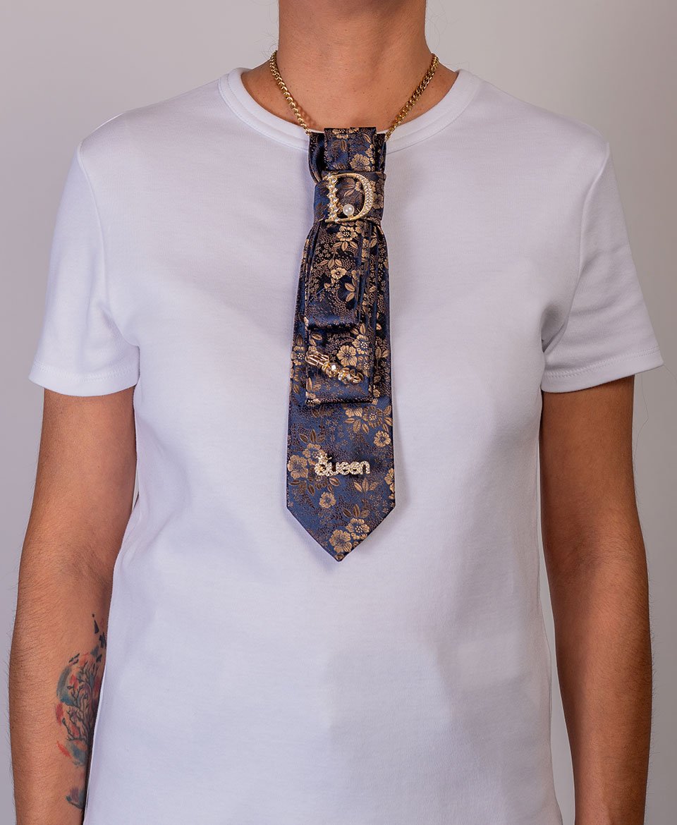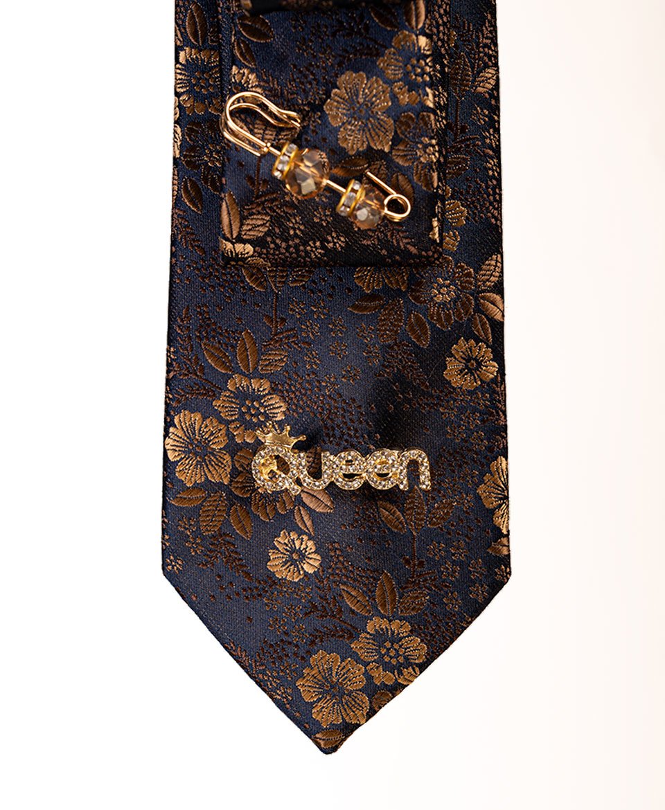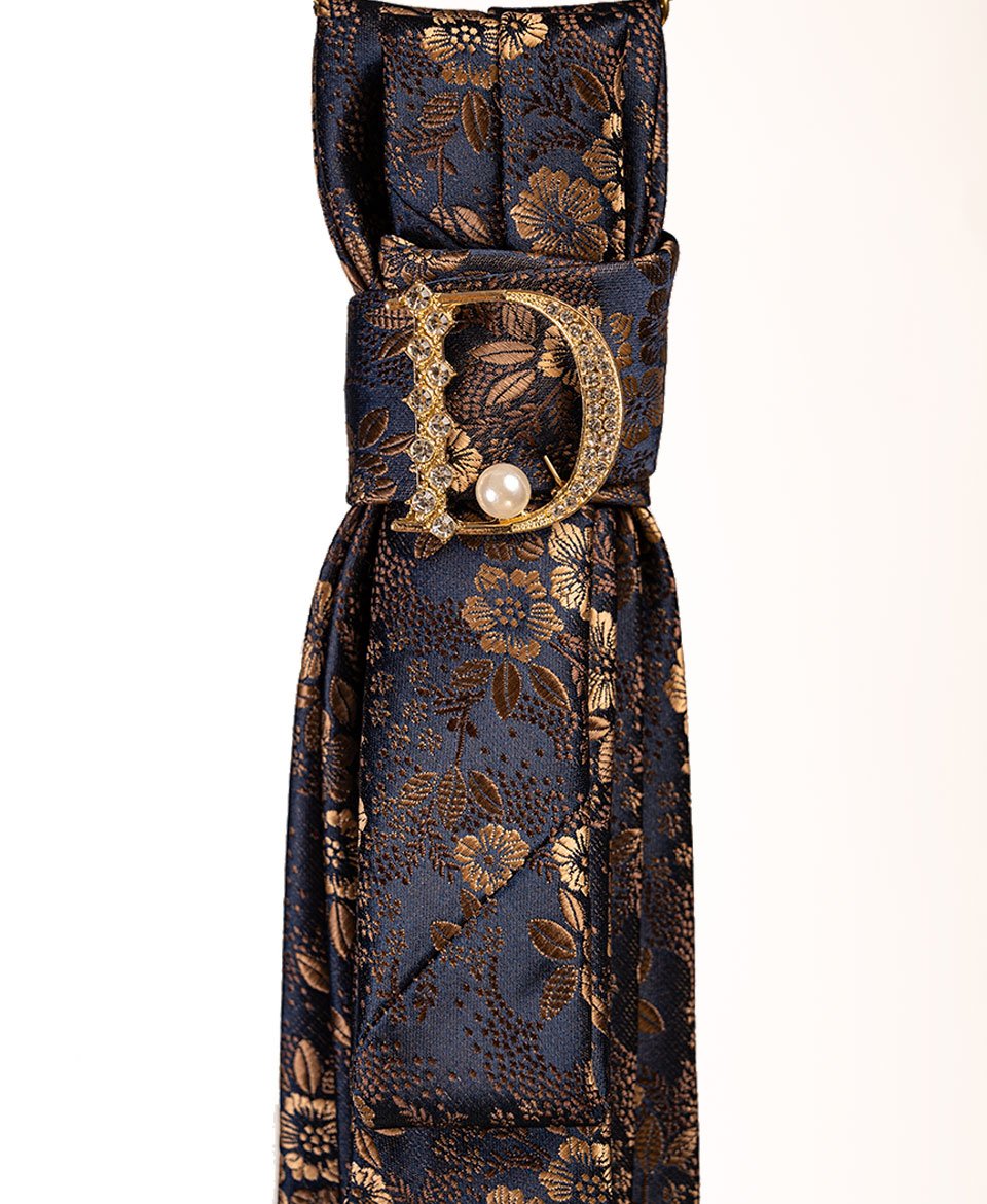 L’élégance d’un jardin secret illuminé par la lune. Cette cravate jacquard bleu nuit aux motifs floraux dorés s’orne d’une broche lettre D sertie de perles pour une allure romantique et sophistiquée.