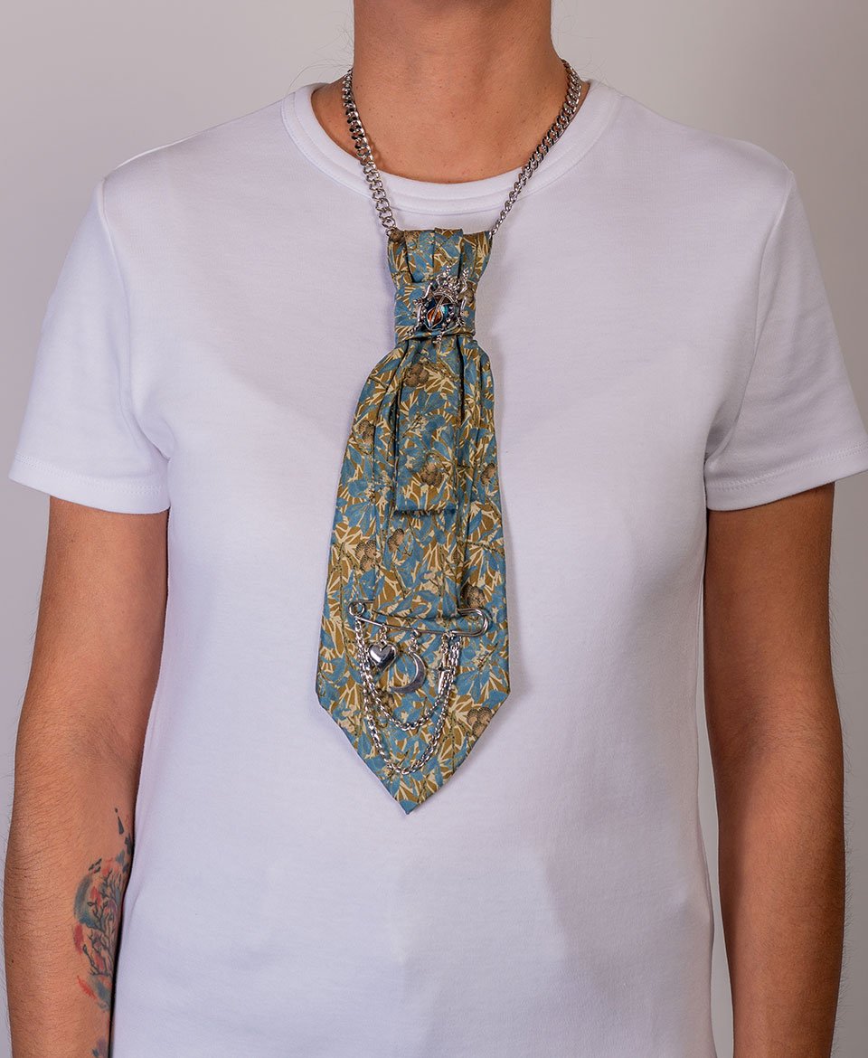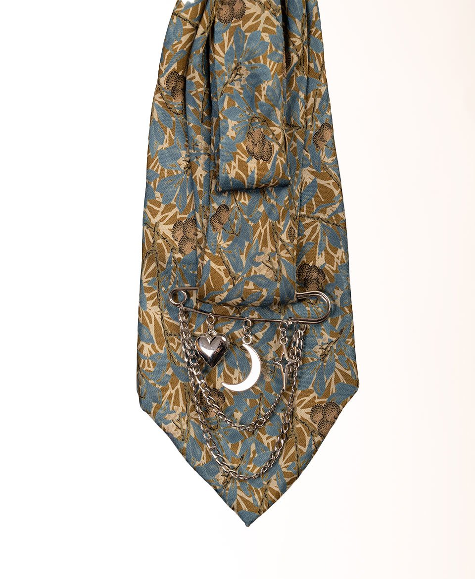 Cette cravate au délicat motif de feuillages kaki et bleu jeans s’orne de broches argentées et de chaînettes pour une élégance mystique et poétique.