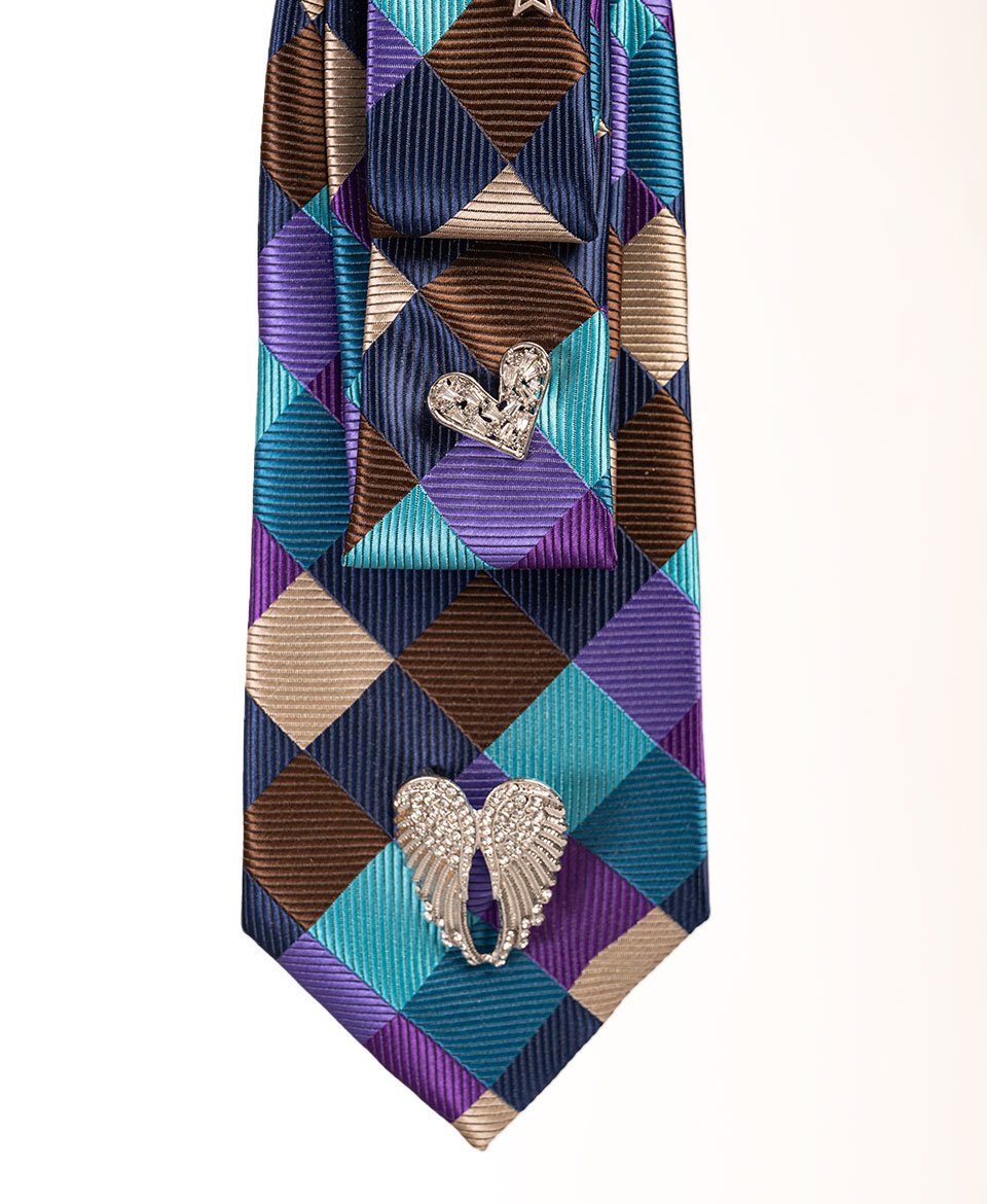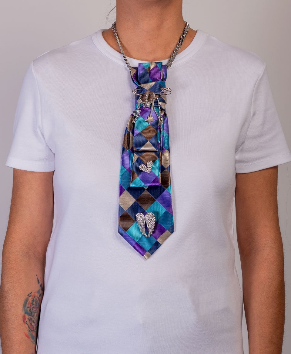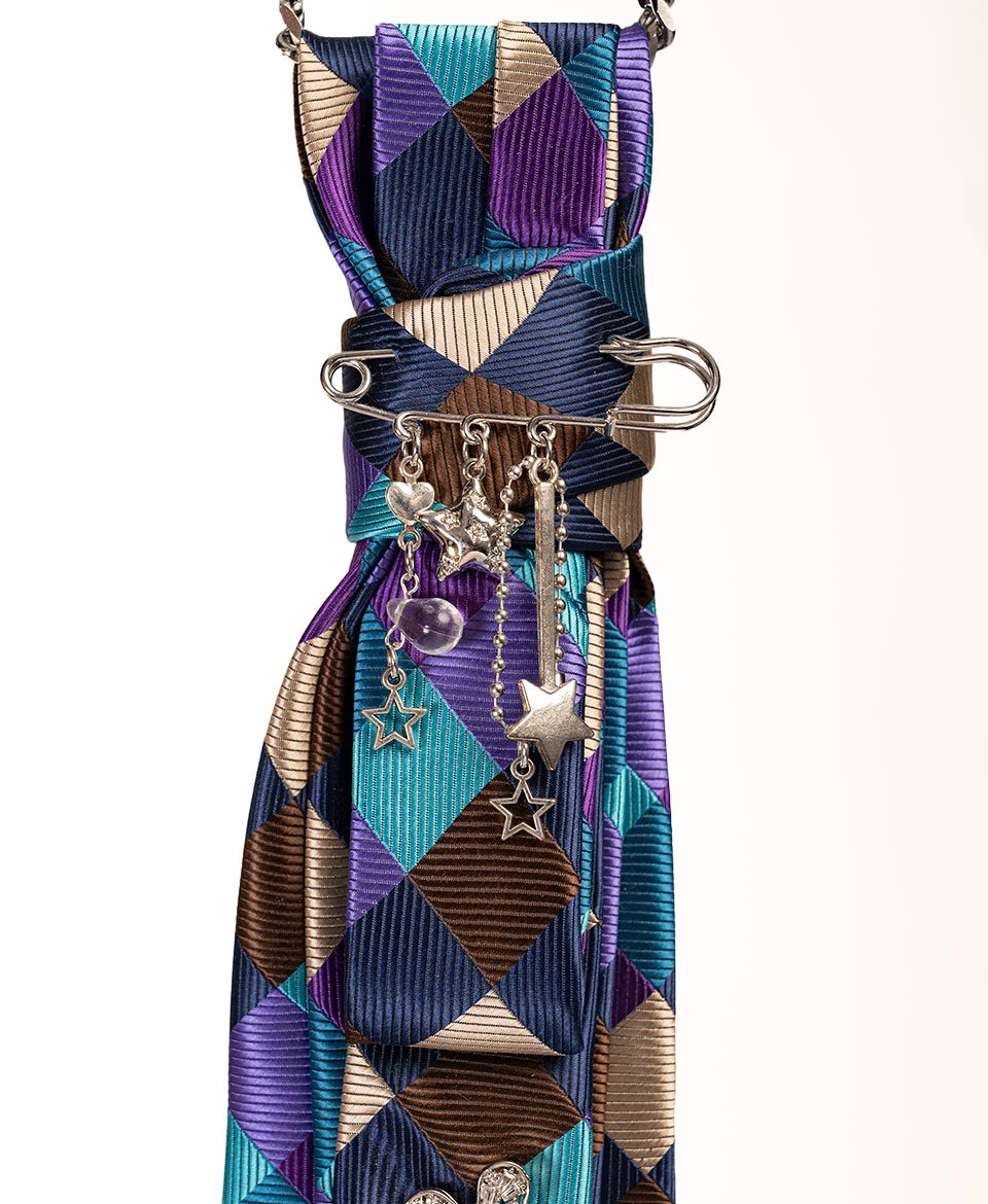 Cette cravate aux motifs losanges vibrants bleu, violet et bronze crée un effet optique saisissant, sublimé par une cascade de breloques argentées pour un style résolument affirmé.