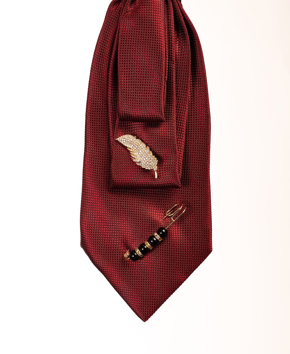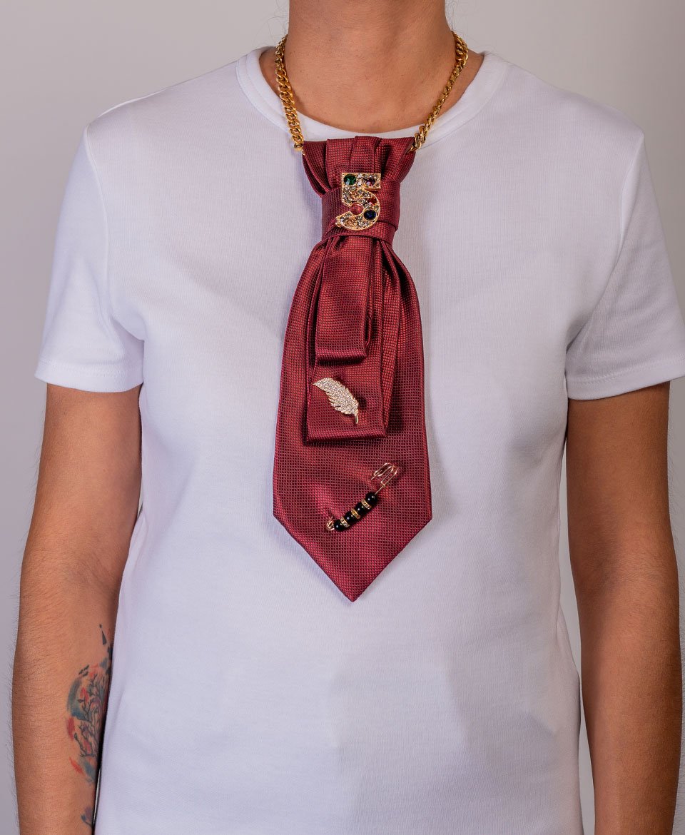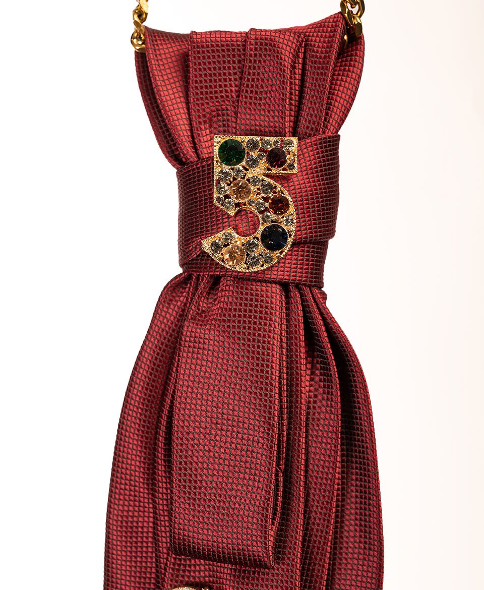 Cette cravate bordeaux au tissage micro texturé s’illumine du chiffre « 5 » iconique doré serti de cristaux.