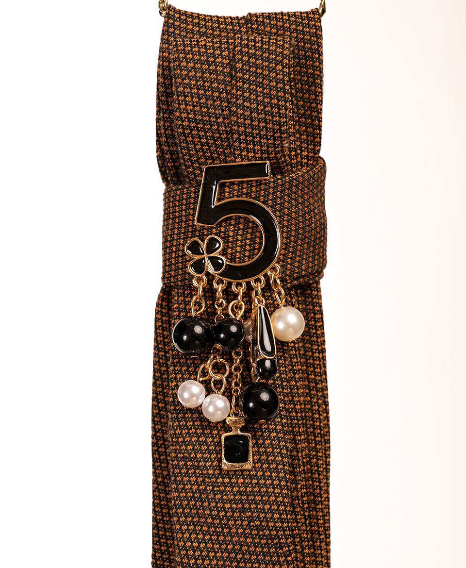 Le tissu texturé capte la lumière tandis que le chiffre « 5 » doré trône fièrement au centre, entouré d’une cascade de breloques raffinées : perles nacrées, cristaux noirs et détails dorés scintillants créent un effet haute couture spectaculaire.