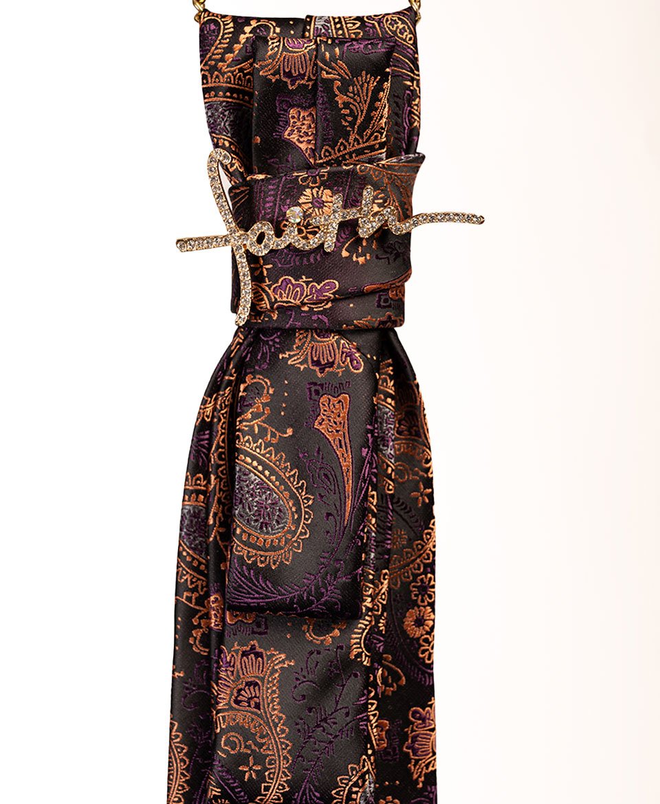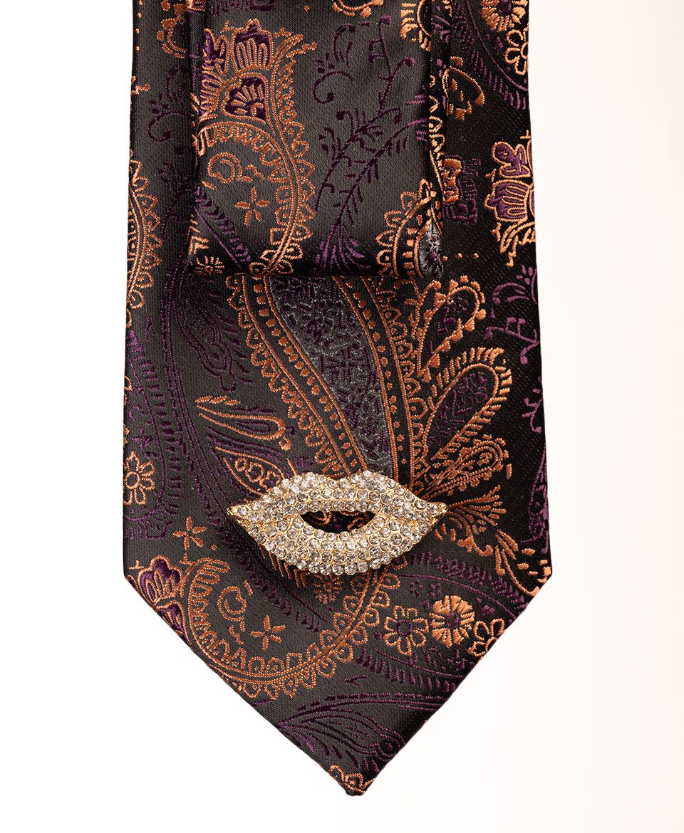 L’opulence orientale revisitée. Cette cravate aux tons prune et cuivre dévoile un somptueux motif paisley rehaussé de broches précieuses pour un style chic irrésistible.