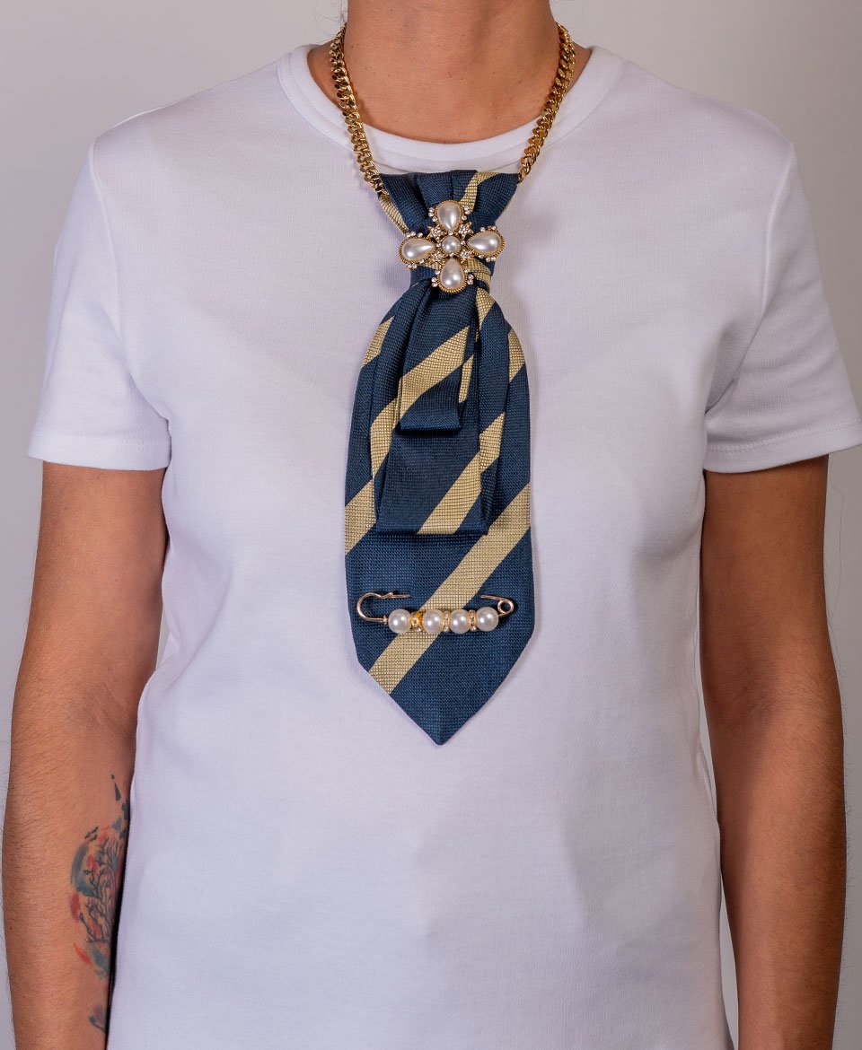 Le preppy rencontre la haute joaillerie. Cette cravate aux rayures diagonales bleu marine et beiges se sublime de perles nacrées pour une élégance classique et précieuse.