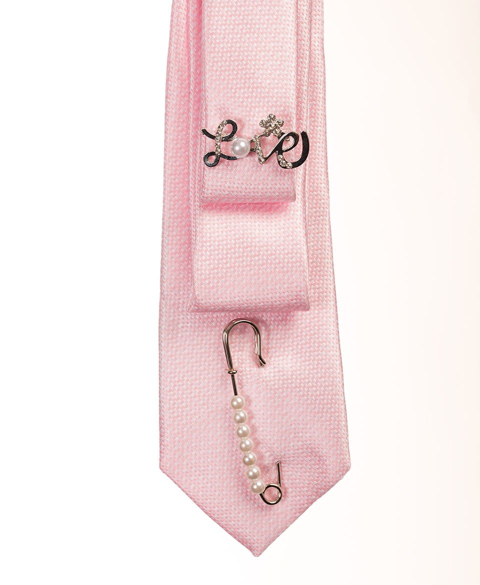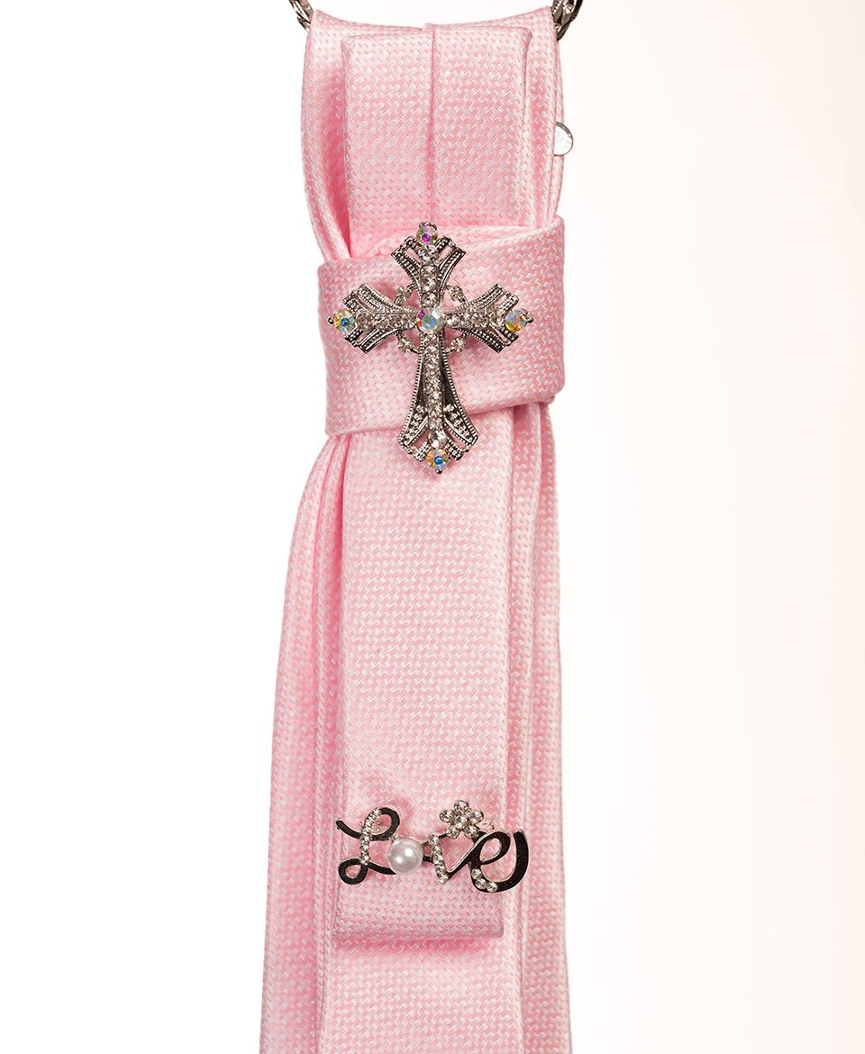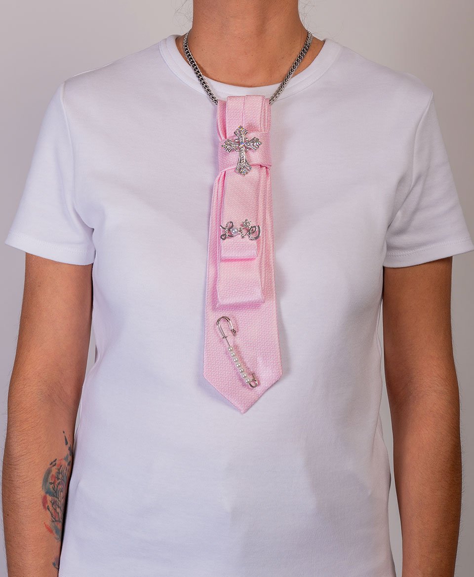 Cette cravate au tissu rose pastel texturé crée une base douce et romantique. La croix argentée sertie de strass irisés apporte une dimension spirituelle et précieuse, tandis que les épingles à nourrice ornées de perles iridescentes ajoutent une touche punk-chic et moderne.