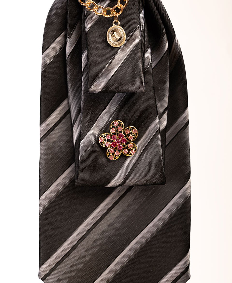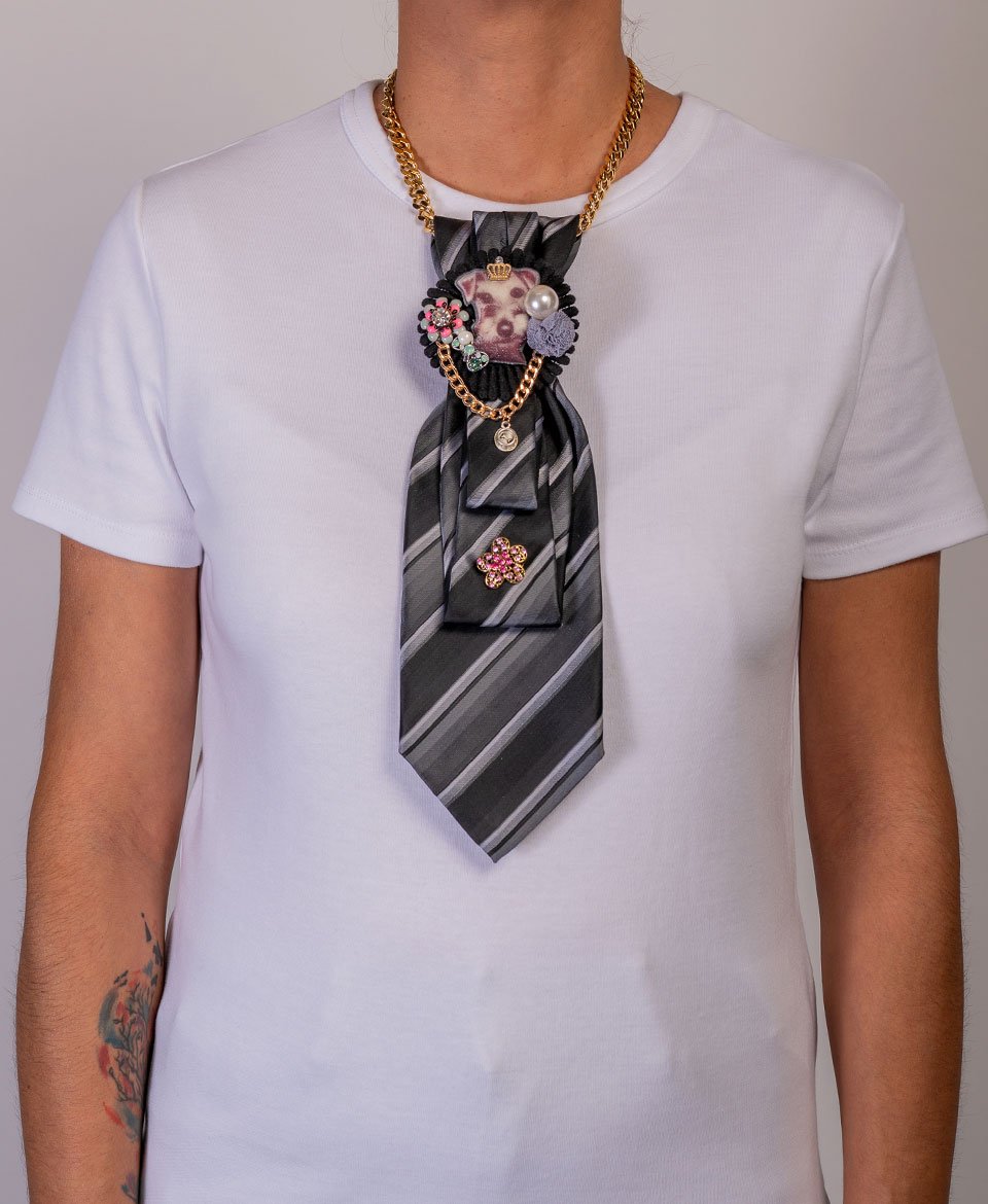 Cette pièce unique marie l’humour du pop art avec l’élégance des bijoux précieux. Le contraste entre le sérieux des rayures et l’excentricité du portrait crée un mix audacieux et amusant.