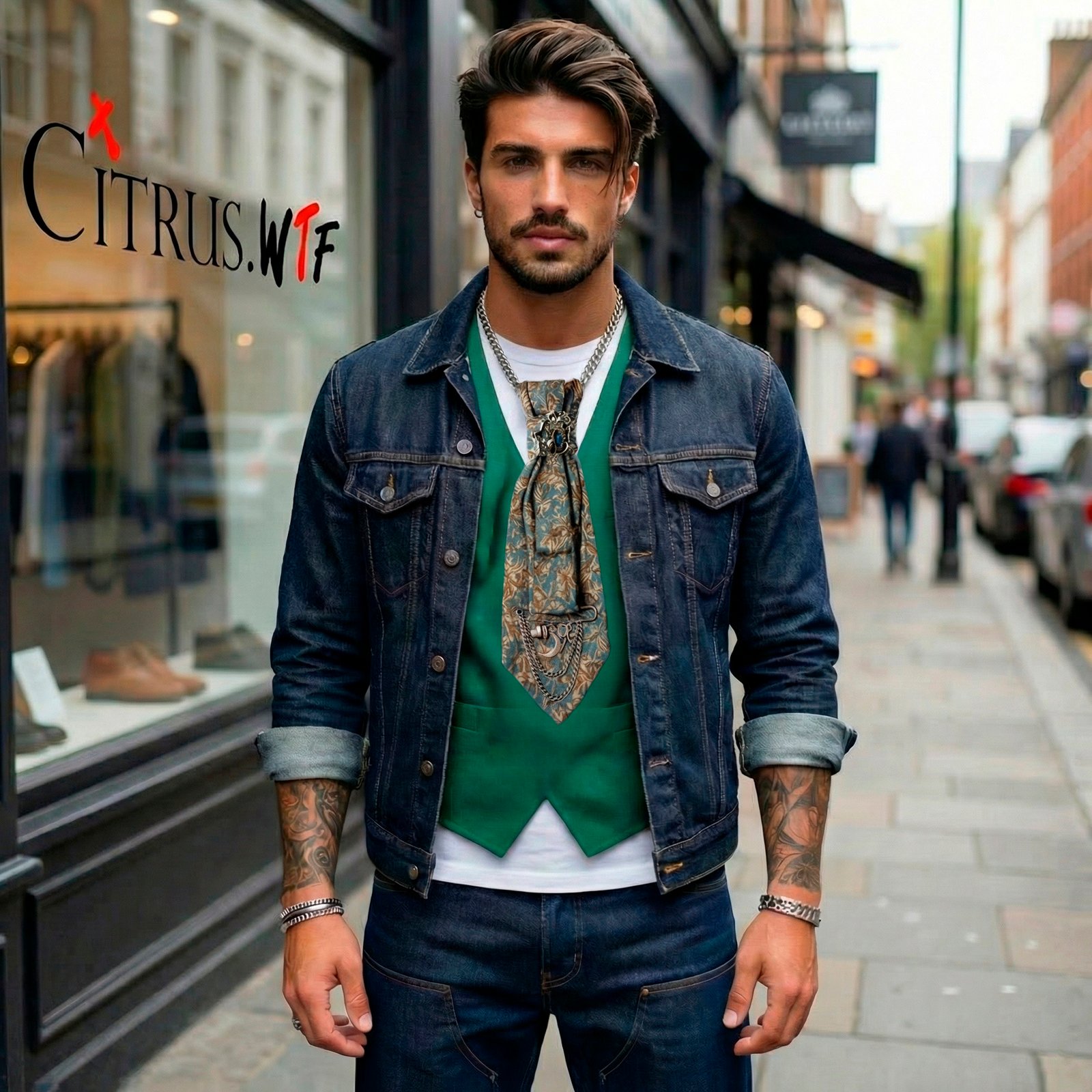 Cette cravate au délicat motif de feuillages kaki et bleu jeans s’orne de broches argentées et de chaînettes pour une élégance mystique et poétique.