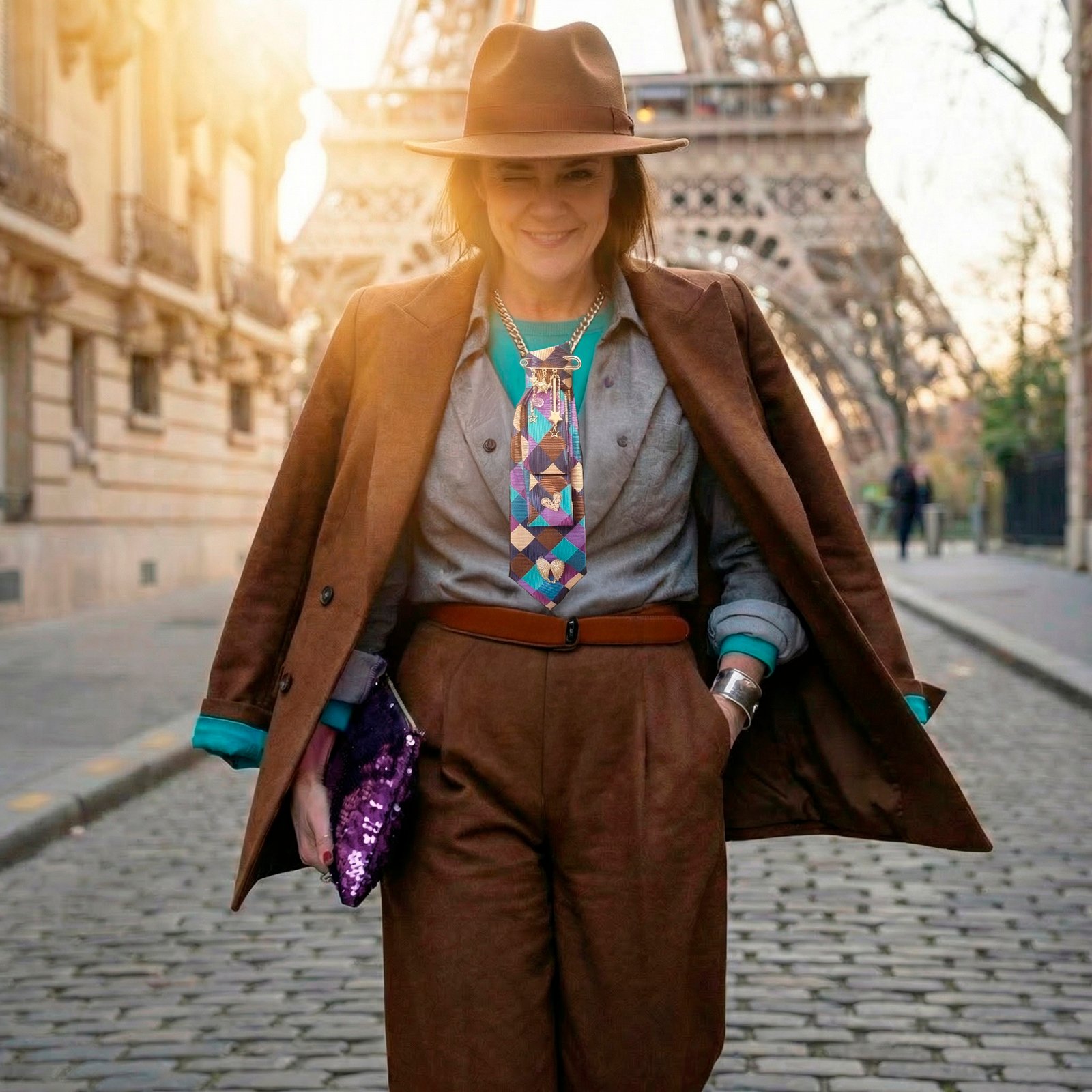 Cette cravate aux motifs losanges vibrants bleu, violet et bronze crée un effet optique saisissant, sublimé par une cascade de breloques argentées pour un style résolument affirmé.