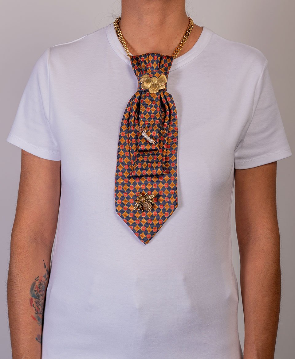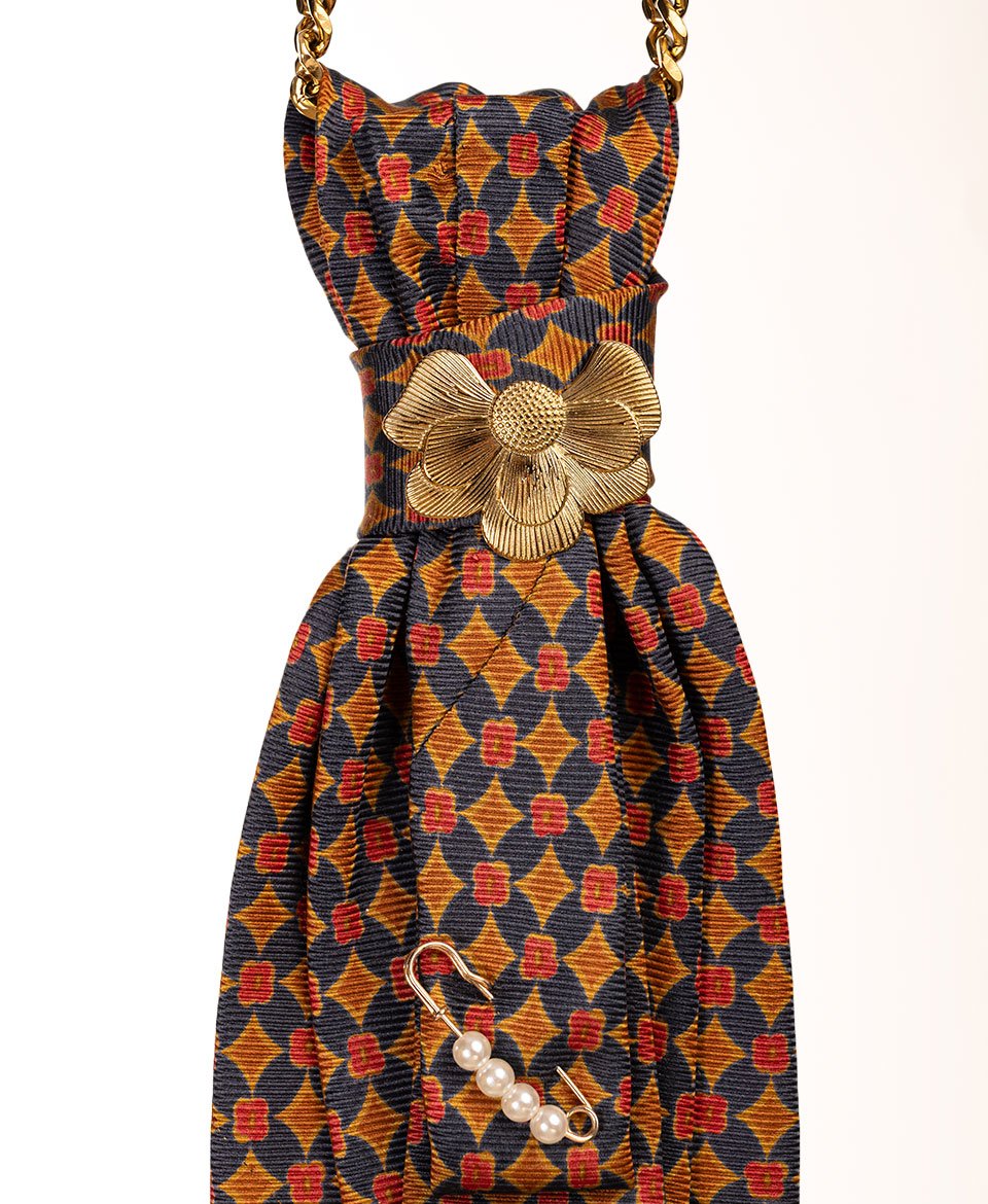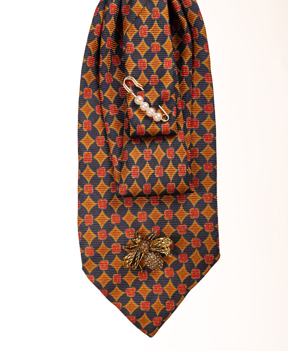 Le tissu déploie un motif géométrique vintage de losanges entrelacés dans une palette riche : bleu marine, orange brûlé, jaune moutarde et rouge créent une mosaïque rétro captivante. La délicate broche florale dorée au nœud et l’abeille précieuse en bas ajoutent une dimension nature chic et raffinée.